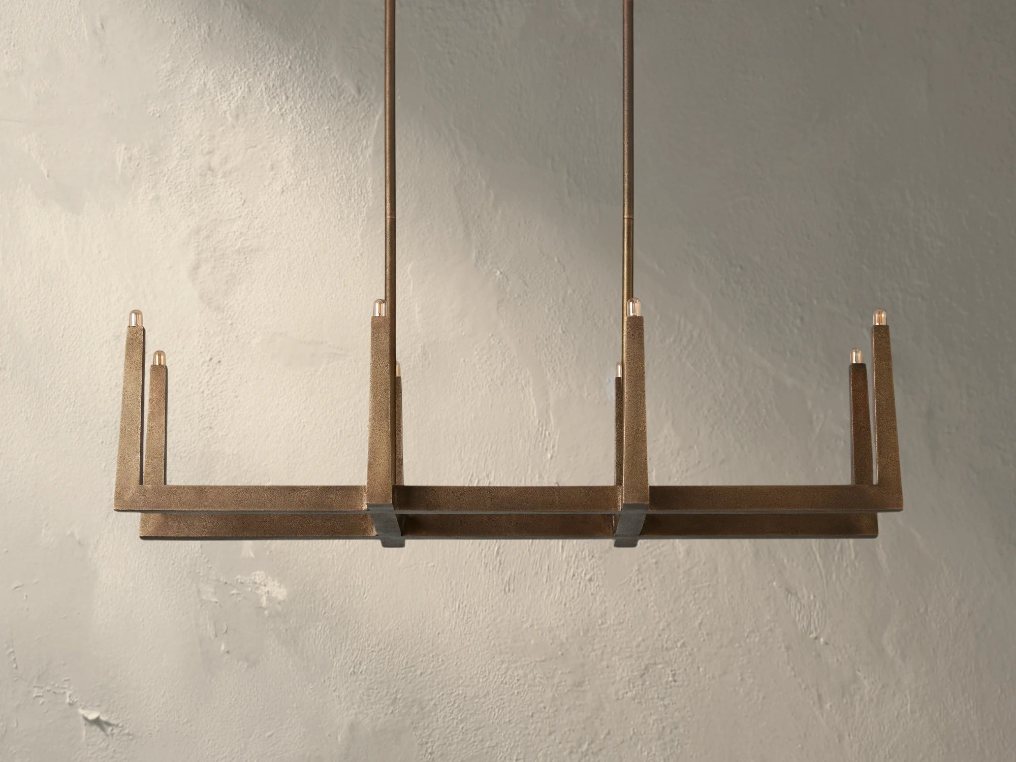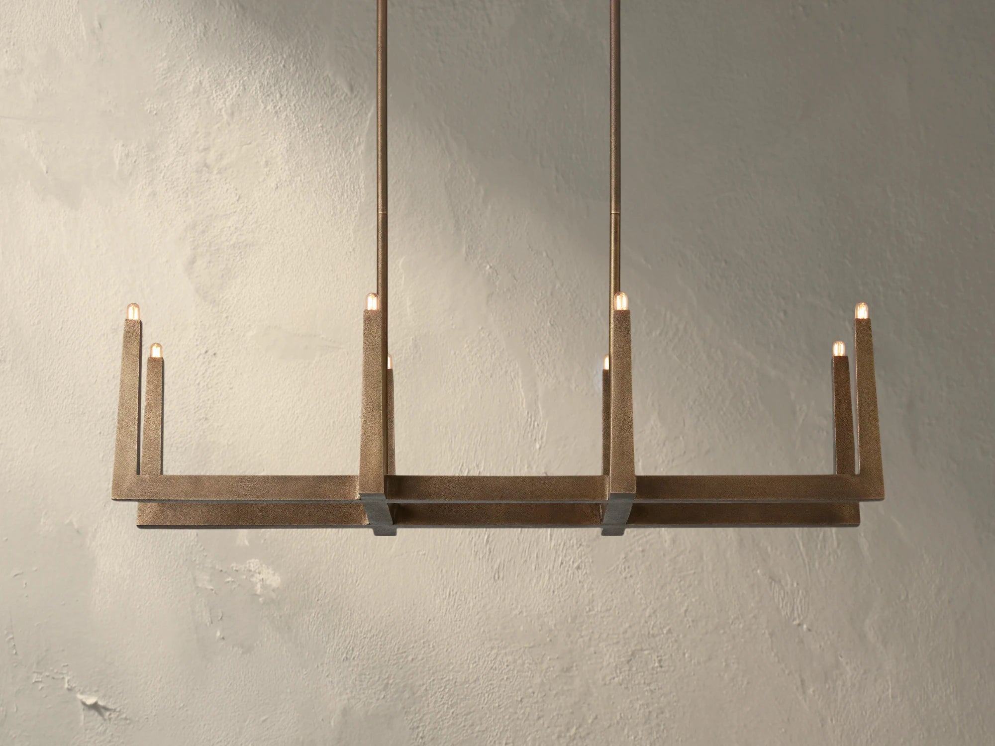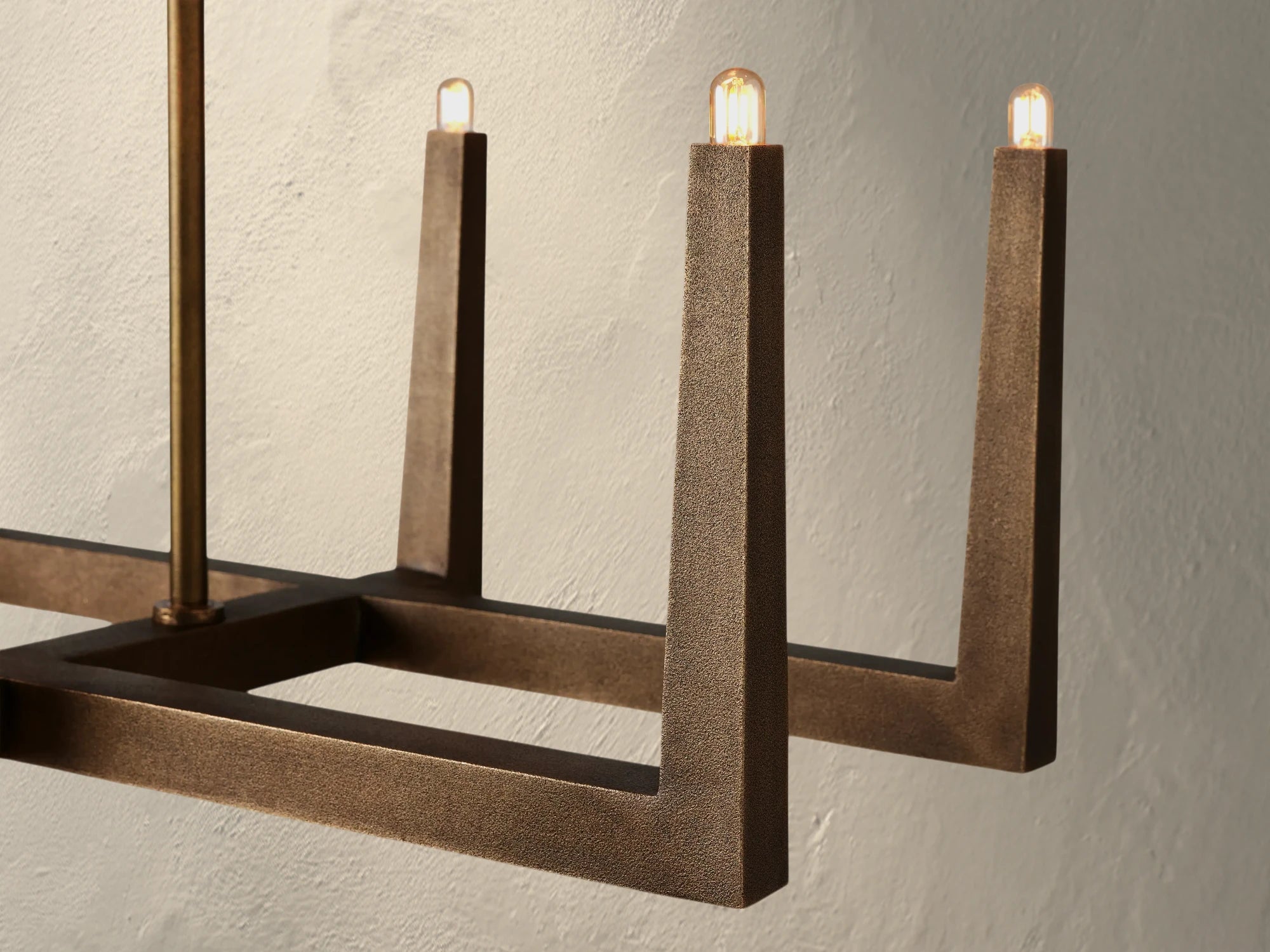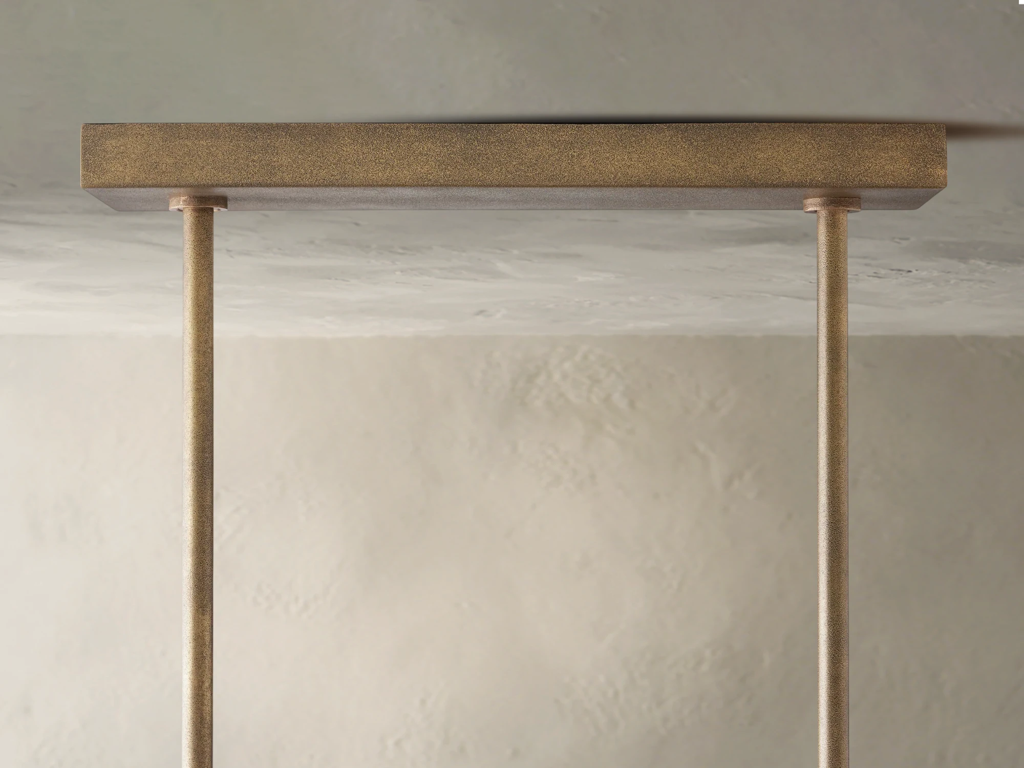 Defined by clean lines and sculptural simplicity, the Voorn Linear Chandelier brings structure and style to open-concept spaces. Handcrafted in India from sand-casted brass with a tactile antique or bronze finish, its crisscrossed frame plays with form and negative space for a bold yet airy silhouette. Available in three lengths and equipped with interchangeable rods and bulbs, this design is ideal for dining tables, kitchen islands, or modern living spaces that call for architectural presence.